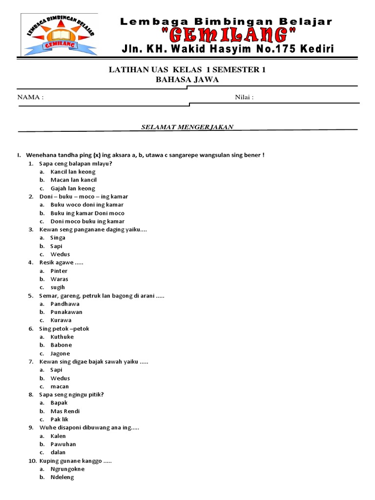 Maybe you would like to learn more about one of these? Materi bahasa jawa kelas 11 semester 1 upacara adat guru ilmu sosial. Soal pts bhs jawa smk kelas 10 semester 1 tahun 2021.kali ini admin ilmuguru.org akan memberikan latihan soal dan kunci jawaban uts semester ganjil mapel bahasa jawa program keahlian semua jurusan khususnya kelas x smk/mak kurikulum 2013 tahun 2021/2022 untuk bisa kamu pelajari untuk menghadapi ulangan nanti. 1 silabus basa jawa kelas 7. 1 c 6 b 11 e 16 c 2 d 7 a 12 b 17 e 3 a 8 e 13 c 18 c 4 e 9 b 14 e 19 b 5 c 10 a 15 d 20 b persiapan ujian akhir semester.