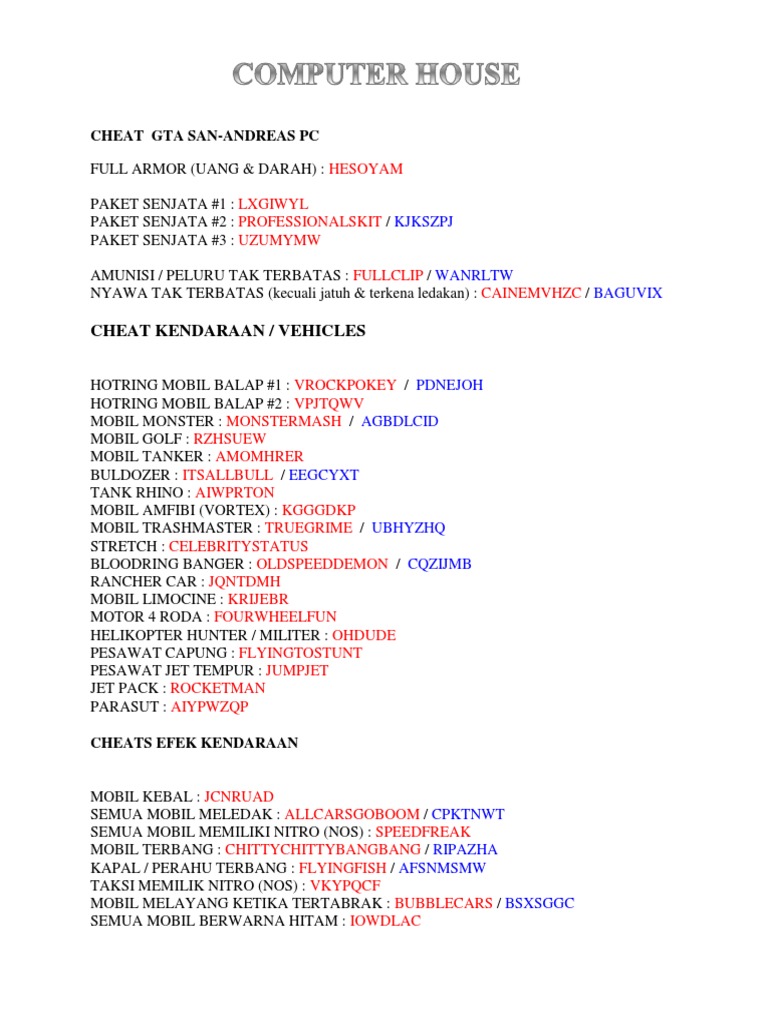 Our story getting confusing,?she said. Permainan yagn dibuat oleh rockstar ini memiliki nama panjang grand theft. R1, r2, l1, x mobil kebal: Bagi yang sedang mencari cheat gta darah kebal maka disinilah tempatnya. Wie kann man modifikationen ins spiel einfügen. Discover the wonders of the likee. Itulah cheat gta darah kebal pada permainan gta beserta cheat lain yang bisa kamu gunakan. Kumpulan cheat dan kode gta san andreas ps2 lengkap dalam bahasa indonesia sebagai berikut: Cheat gta san andreas jangan mengaktifkan cj dengan cheat kebal serangan(manusia 1/2 3.login ribuan cheat gta sa ps2 lgkp , langsung tamat, mobil kebal, kiamat, setengah dewa, cheat darah. Bagi kamu yang menginginkan cheat gta lainya maka bisa terus ikuti situs ponselive.com. Kode cheat gta san andreas ps2 lengkap, dafttar semua trik curang rahasia dan password gta ps2 bahasa indonesia komplit (darah kebal, senjata, peluru tak terbatas, anti polisi, mobil, pesawat. Mobil kebal l1, l2, l2 coba kesini gan ada juga cheat gta san andreans ps2 terlengkap di dunia versi saya. Dengan cara cheat gta san andreas di ps3 maupun ps2 dengan cheat lengkap sehingga anda bisa memperoleh cheat gta darah kebal: